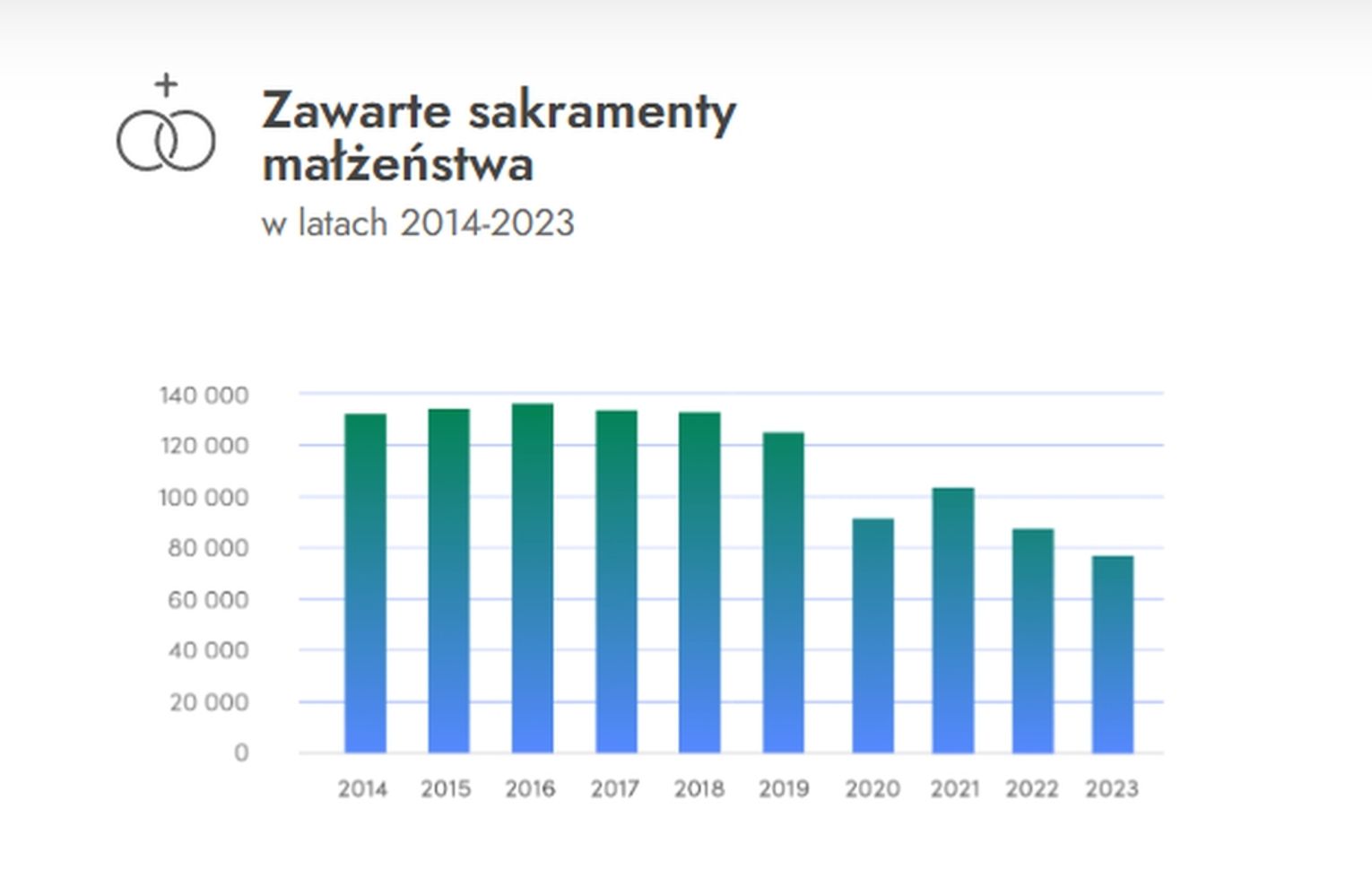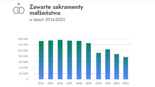Mniej jest także dzieci przystępujących do pierwszej komunii – 325 tys. osób przy spadku o 3,6 p. proc. Mniej także zawieramy małżeństw kościelnych. Było ich 77,2 tys. czyli o 12,1 p. proc. mniej niż rok wcześniej.