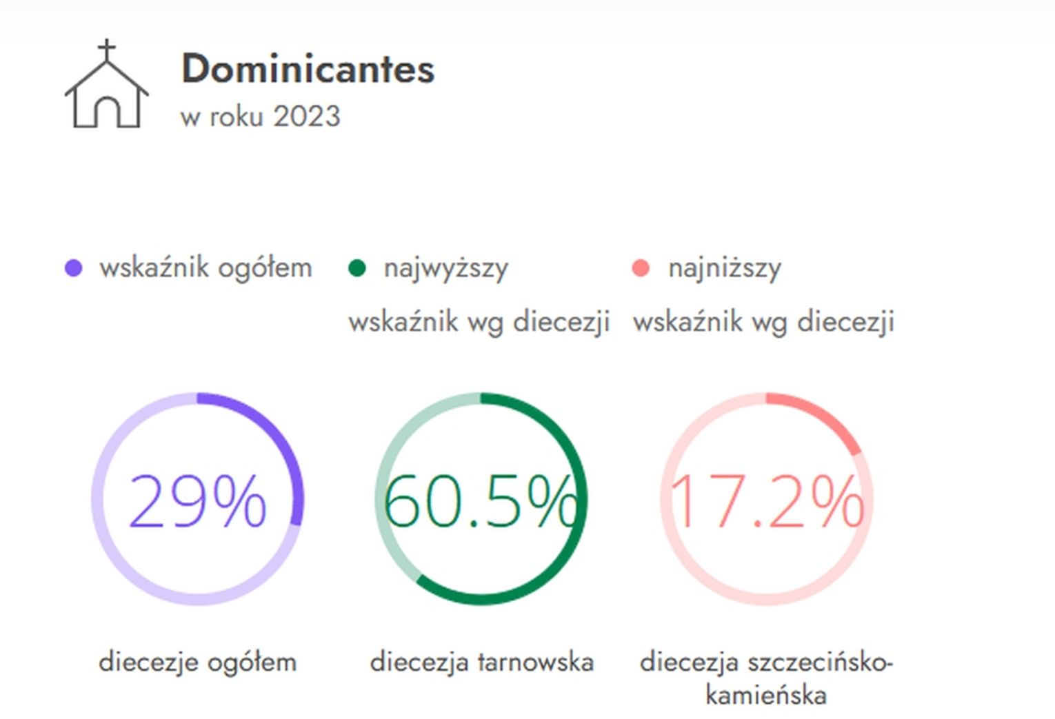 To uśrednione dane, bo polskie regiony się znacząco od siebie różnią. Na przykład najwyższy wskaźnik dominicantes odnotowano tradycyjnie w diecezji tarnowskiej (60,5 proc. ) i rzeszowskiej (53,2 proc. ). Najniższy zaobserwowano w diecezji szczecińsko-kamieńskiej (17,2 proc) i sosnowieckiej (17,87 proc.).
