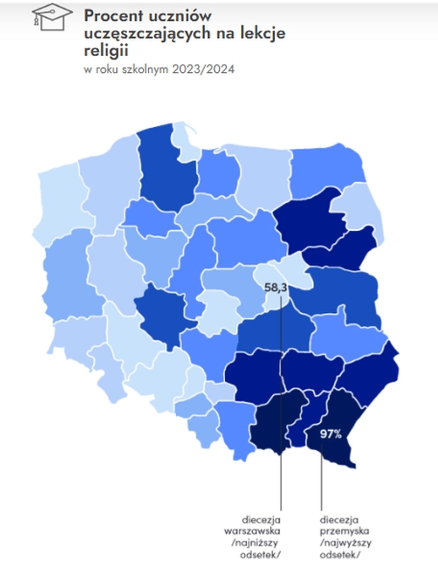 W roku szkolnym 2023/2024 na lekcje religii chodziło 78,6 proc. uczniów. To spadek z 80,3 proc rok temu i z 87,6 proc. sprzed pięciu lat. Najwyższy odsetek uczniów uczęszczających na lekcje religii odnotowano w diecezji przemyskiej (96,0 proco.), tarnowskiej (95,9 proc.), a najniższy w diecezji warszawskiej (58,3 proc.), warszawsko-praskiej (61,6 proc.) oraz wrocławskiej (63,5 proc.).