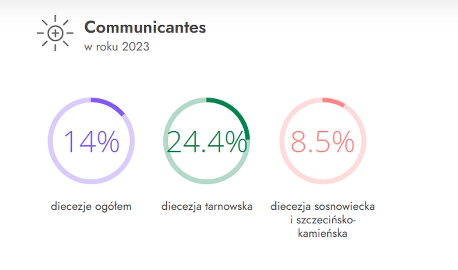 Zgodnie z najnowszymi danymi dominicantes w 2023 r. wyniósł 29,02 proc., a communicantes 14,02 proc. To spadek rok do roku o 0,5 p. proc i wzrost o 0,1 p. proc. Ale jeszcze w 2019 r. wskaźnik dominicantes wynosił 36,9 proc. a communicantes 16,7 proc.