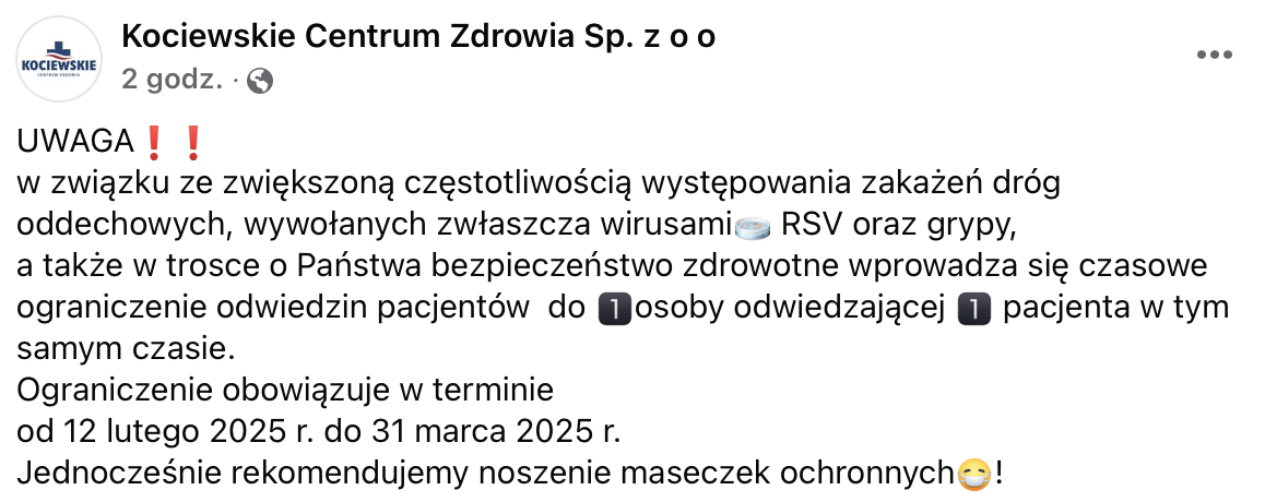 Od 12 lutego do 31 marca w Kociewskim Centrum Zdrowia obowiązuje zasada: 1 pacjent - 1 odwiedzający w tym samym czasie. Ma to na celu ograniczenie ryzyka rozprzestrzeniania się wirusów wśród hospitalizowanych osób oraz personelu. Dodatkowo starogardzka placówka zaleca noszenie maseczek ochronnych przez odwiedzających.
