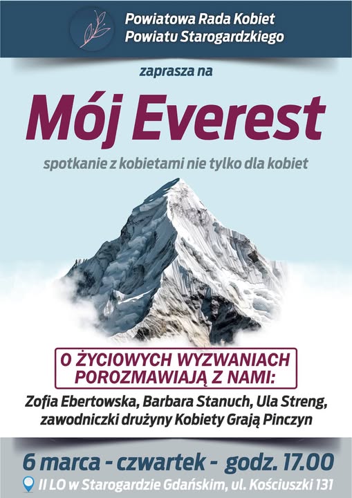Serdecznie zapraszamy Was na Mój Everest - spotkanie z wyjątkowymi Kobietami. Kobietami, które pokonały i nadal pokonują wiele przeszkód, idąc do celu. Choć tematy rozmów będą różne, nie zawsze lekkie i przyjemne, mamy nadzieję, że uda nam się - wspólnie z Wami - stworzyć ciepłą i przyjazną atmosferę, sprzyjającą dzieleniu się refleksjami i wspomnieniami.
