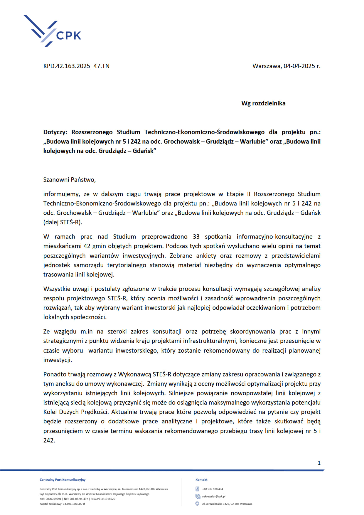 Wszystkie uwagi i postulaty dotyczące przy przebiegów linii kolejowej i lokalizacji infrastruktury towarzyszącej, takie jak między innymi układu drogowego, zostaną przeanalizowane przez zespół projektowy, który oceni możliwość i zasadność wprowadzenia poszczególnych rozwiązań. Część uwag, na przykład ta dotycząca rozwiązań drogowych, może być wprowadzona także na kolejnych etapach realizacji inwestycji, między innymi na etapie koncepcji programowo-przestrzennej lub projektu budowlanego.