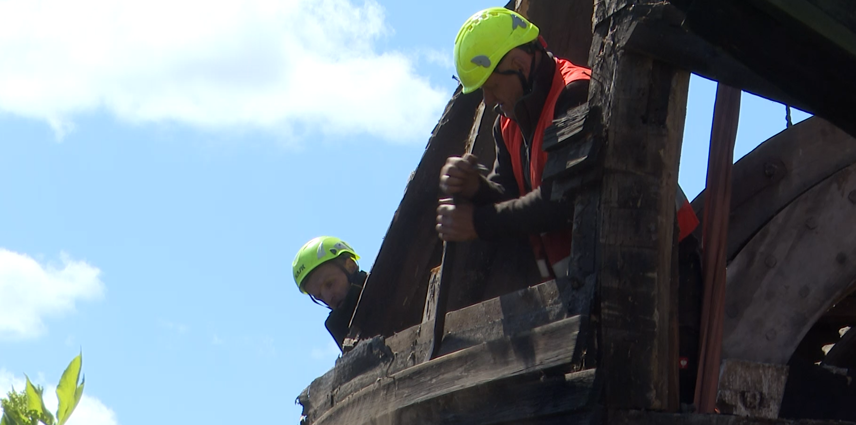 Jest to praca bardzo specjalistyczna, wymaga naprawdę dużych kompetencji wiedzy, ale częściowo tą pracę należy wykonywać poza miejscem posadowienia wiatraka, więc dlatego wiatrak częściowo zostanie rozebrany po to, żeby jego elementy uległy naprawie, ale już w miejscach do tego przeznaczonych, czyli fachowych warsztatach. Prace przebiegają na razie zgodnie z planem. Wiatrak możemy uspokoić, że wiatrak wróci na swoje miejsce mimo tej częściowej rozbiórki.