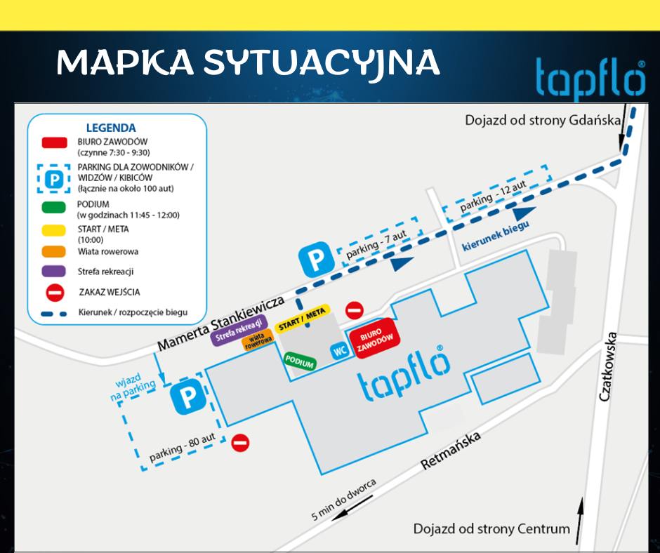 Start i meta biegu ulokowane zostaną przy ulicy Czatkowskiej 4B w Tczewie, w sąsiedztwie siedziby firmy Tapflo. Start zaplanowano na godzinę 10, a eletroniczne zapisy dla biegaczy są już zamnkięte. Wciąż warto jednak rozważyć pojawienie się w miasteczku biegowym, by pokibicować. Przy lini startu i mety stanie scena wraz ze strefą rozrywki, w której będzie można spotkać animatorów ze Sport Level. Dzieci będą mogły się bawić na dmuchanych zjeżdżalniach.