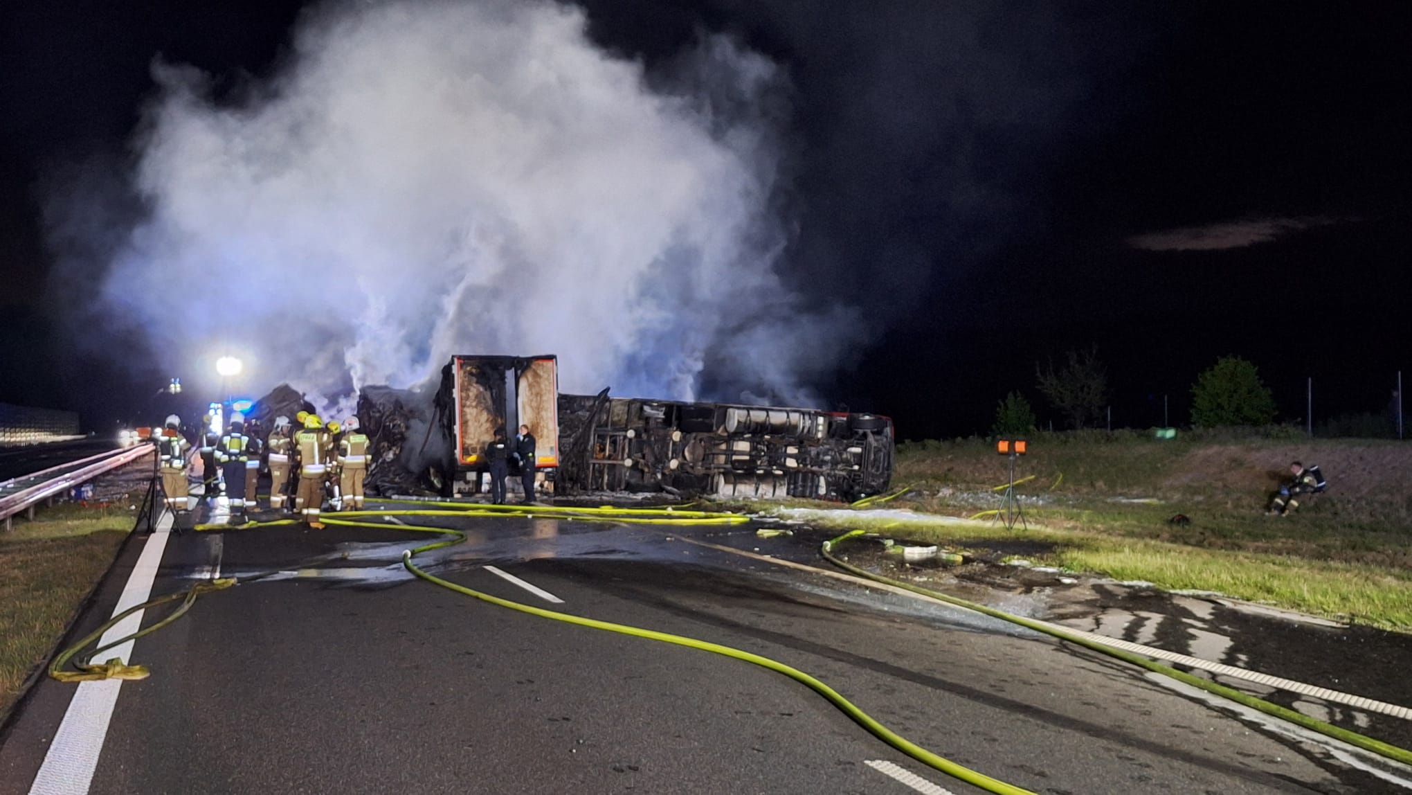 Strażacy zakończyli już swoje działania, w których brało udział 7 zastępów, natomiast na miejscu wciąż pracują pomoc drogowa oraz operator autostrady.