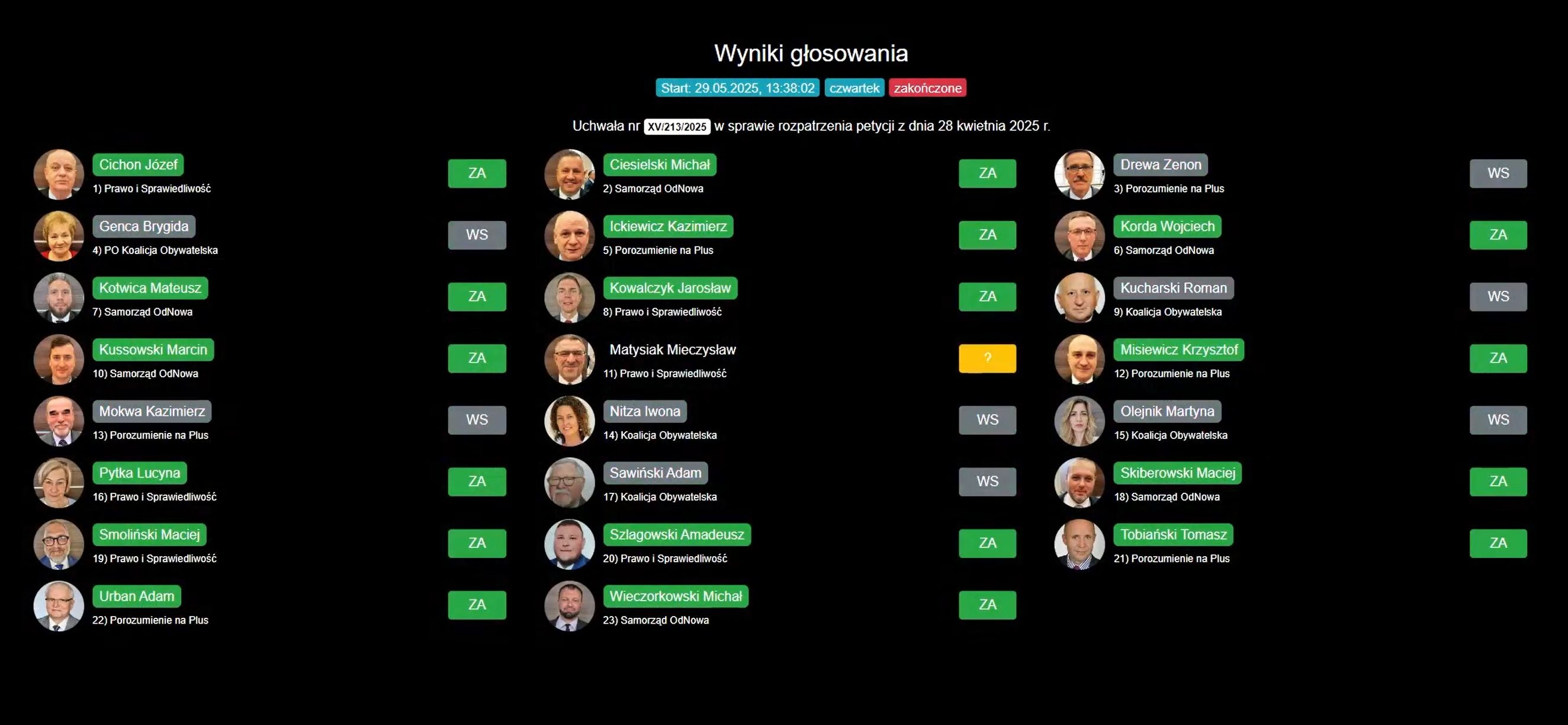 W wyniku głosowania petycja została przyjęta. 15 radnych zagłosowało za, a 7 wstrzymało się od głosu.