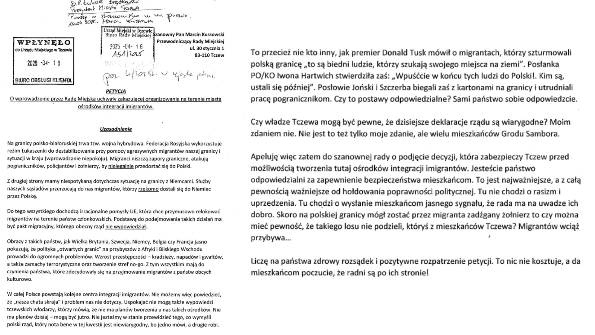 Jej przedmiotem było przyjęcie przez Radę Miasta stanowiska wyrażającego sprzeciw wobec potencjalnych planów utworzenia na terenie Tczewa ośrodka integracji imigrantów.
