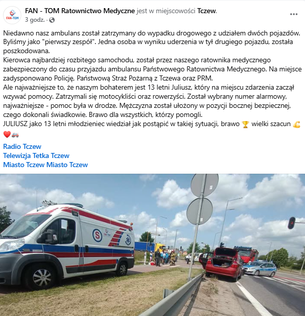 O tej sytuacji opowiedział nam Tomasz Korowaj z firmy FAN – TOM Ratownictwo Medyczne. Został on zatrzymany przez świadków zdarzenia, by udzielić pierwszej pomocy poszkodowanemu mężczyźnie. Jak relacjonuje ratownik medyczny Tomasz Korowaj, jednym z pierwszych świadków, który zaczął działać, był właśnie młody Juliusz: