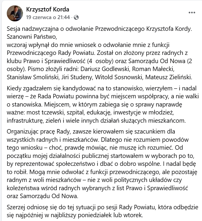 Krzysztof Korda odniósł się do sytuacji w opublikowanym oświadczeniu, które pojawiło się w mediach społecznościowych. Przewodniczący nie kryje zaskoczenia decyzją części radnych: