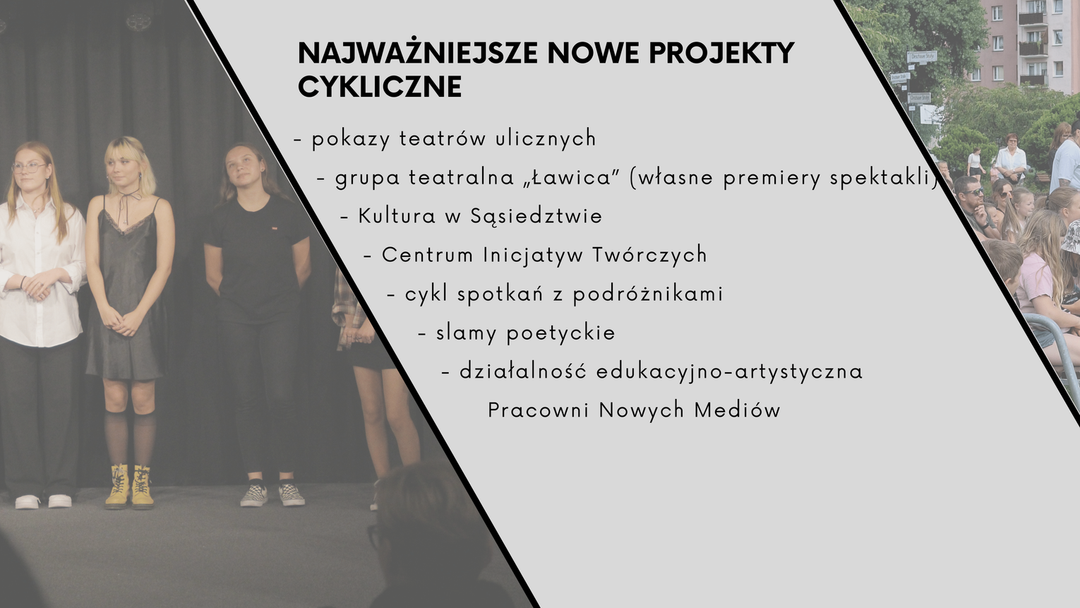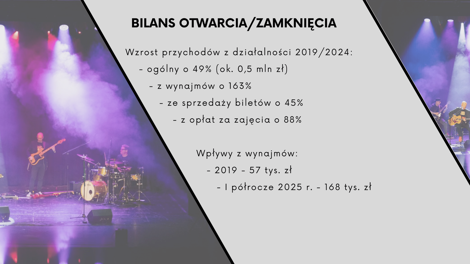 Jednocześnie warto podkreślić, że nawet oferta przygotowywana we współpracy z agencjami artystycznymi nie była przypadkowa. Starannie wybieraliśmy propozycje, kierując się potrzebami i oczekiwaniami mieszkańców oraz naszymi wewnętrznymi standardami jakości. Chodziło o to, aby oferta była różnorodna - od propozycji ambitniejszych po te bardziej rozrywkowe i popularne. Taki model działalności: zróżnicowany i otwarty zawsze uważałem za właściwy dla instytucji kultury.