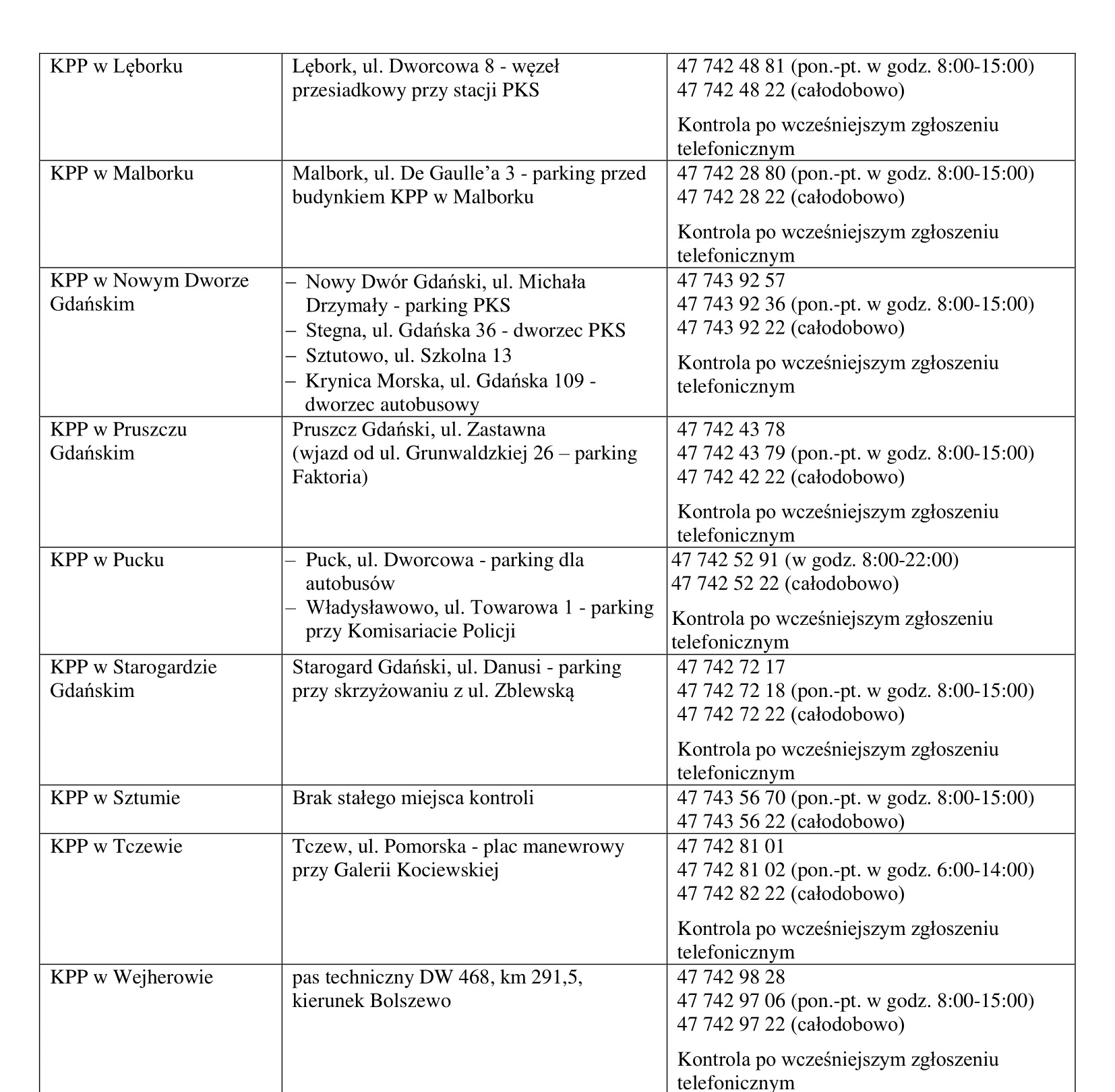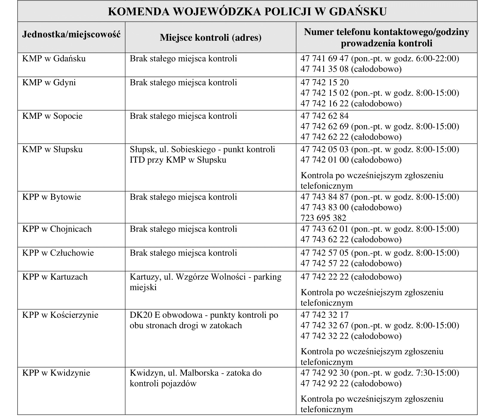 WYKAZ PUNKTÓW KONTROLI NA POMORZU