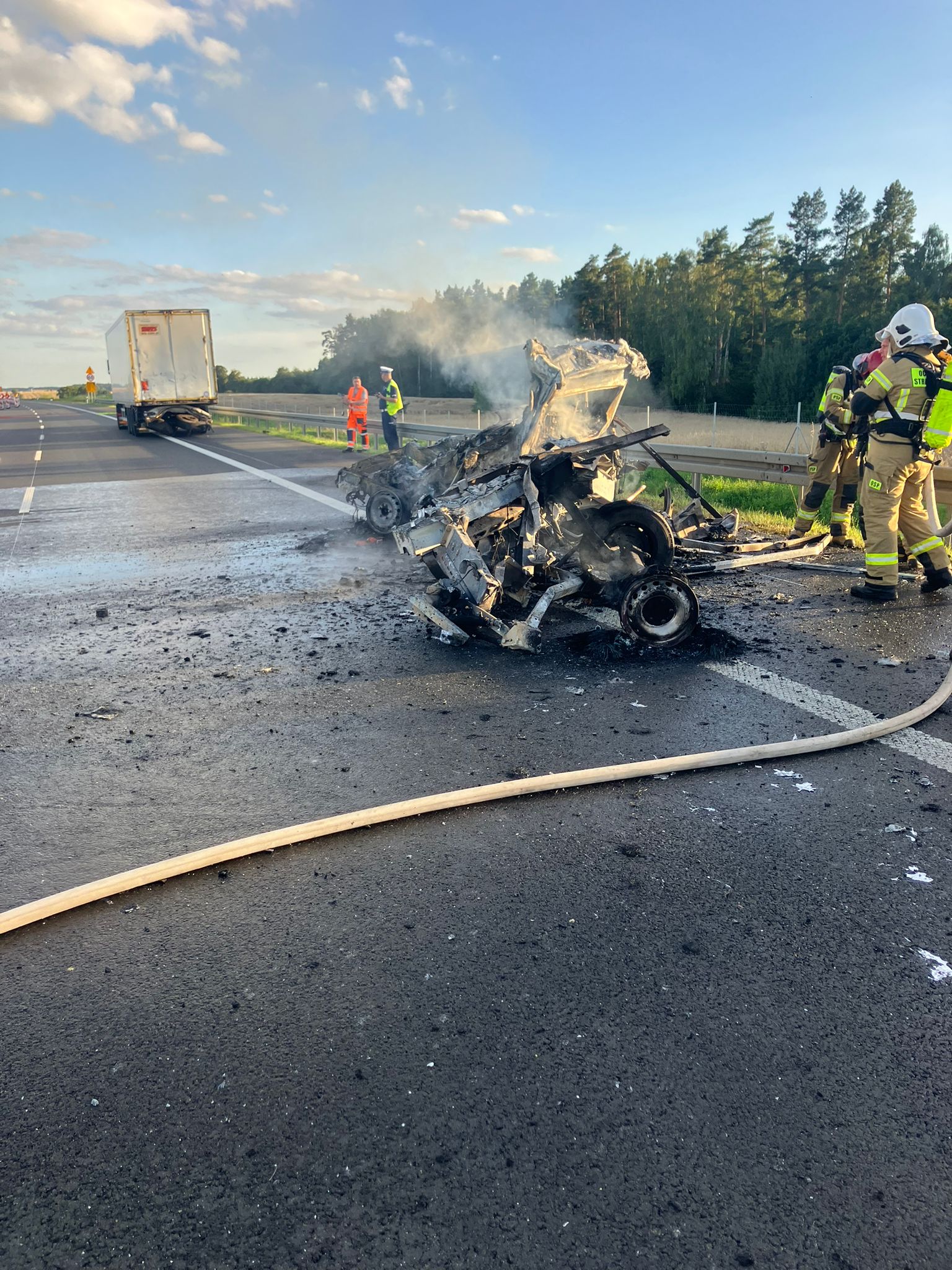 Decyzją policji strażacy wydobywają ciało z pojazdu. Na miejscu zakład pogrzebowy. W końcowej fazie są też działania gaśnicze. Będziemy przegrupowywać ciężkie pojazdy, aby udrożnić ruch w kierunku Gdańska.