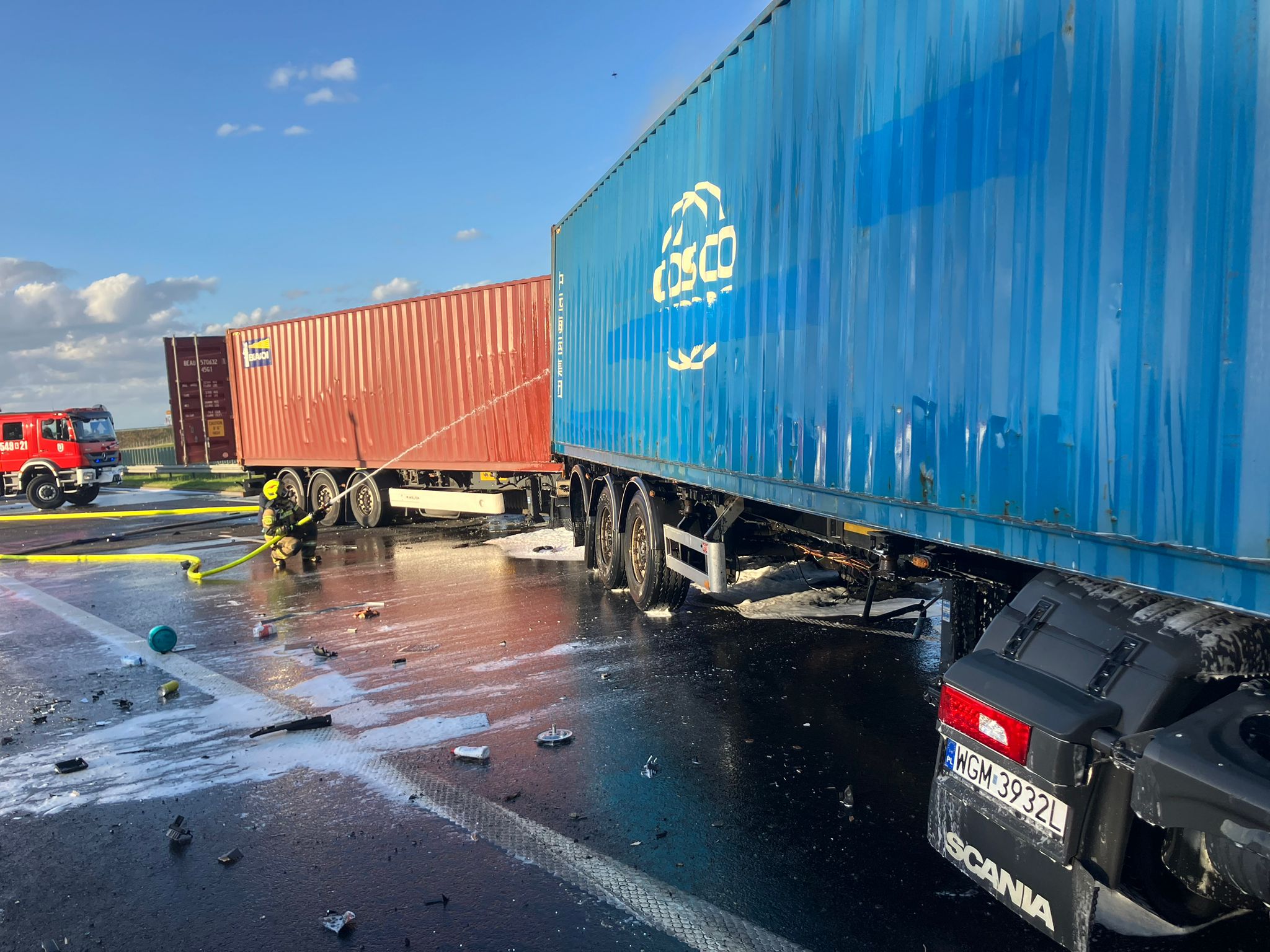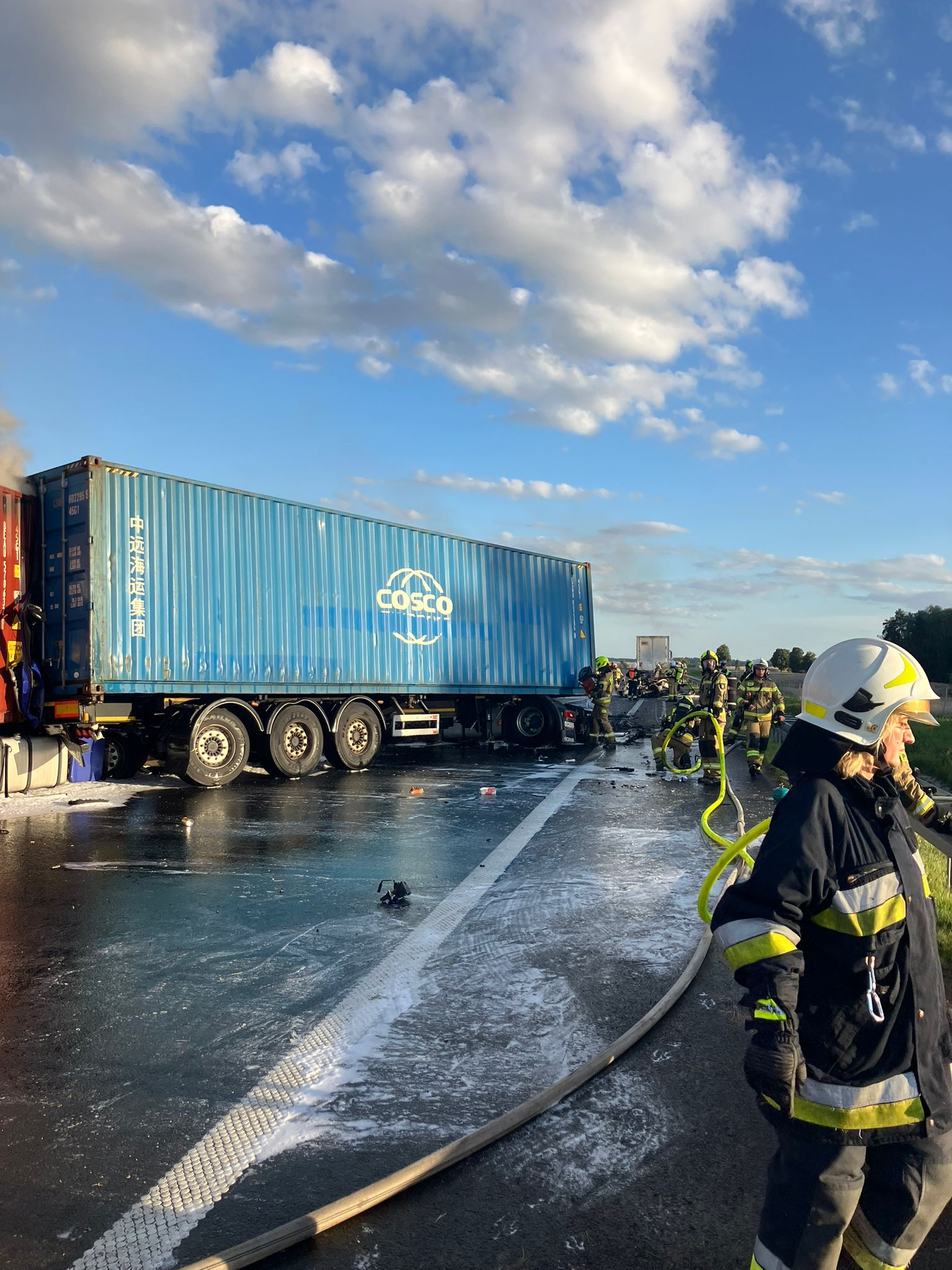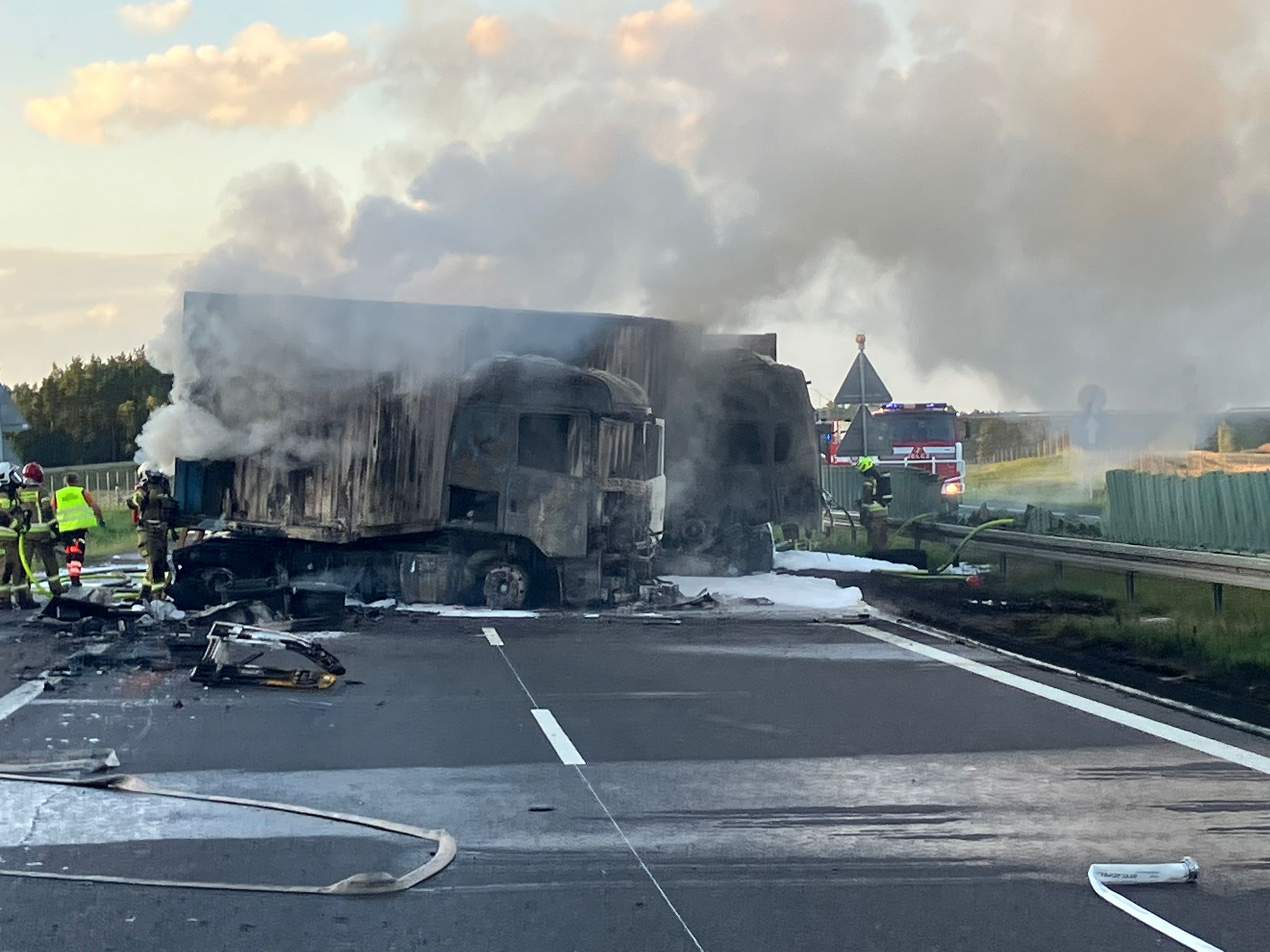 Niestety, w wyniku zdarzenia śmierć poniósł mężczyzna. Dwie osoby zostały ranne i trafiły pod opiekę zespołów ratownictwa medycznego. Po zderzeniu dwa samochody ciężarowe stanęły w ogniu. Na miejscu pracowało 15 zastępów straży pożarnej.