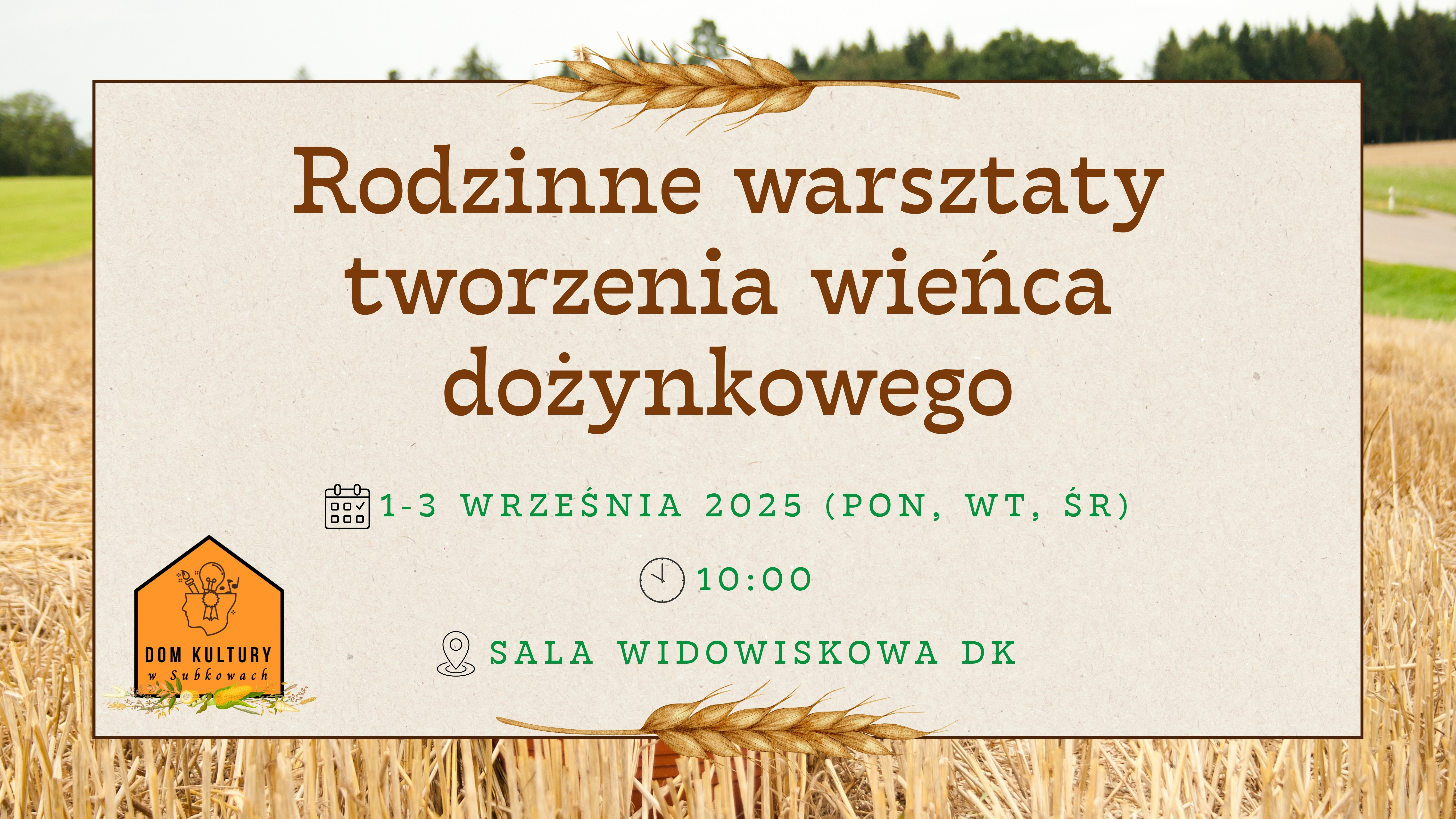 Od poniedziałku, aż do środy potrwają Rodzinne Warsztaty Tworzenia Wieńca Dożynkowego 2025, które odbędą się w salach Domu Kultury w Subkowach w godzinach 10:00 – 13:00.