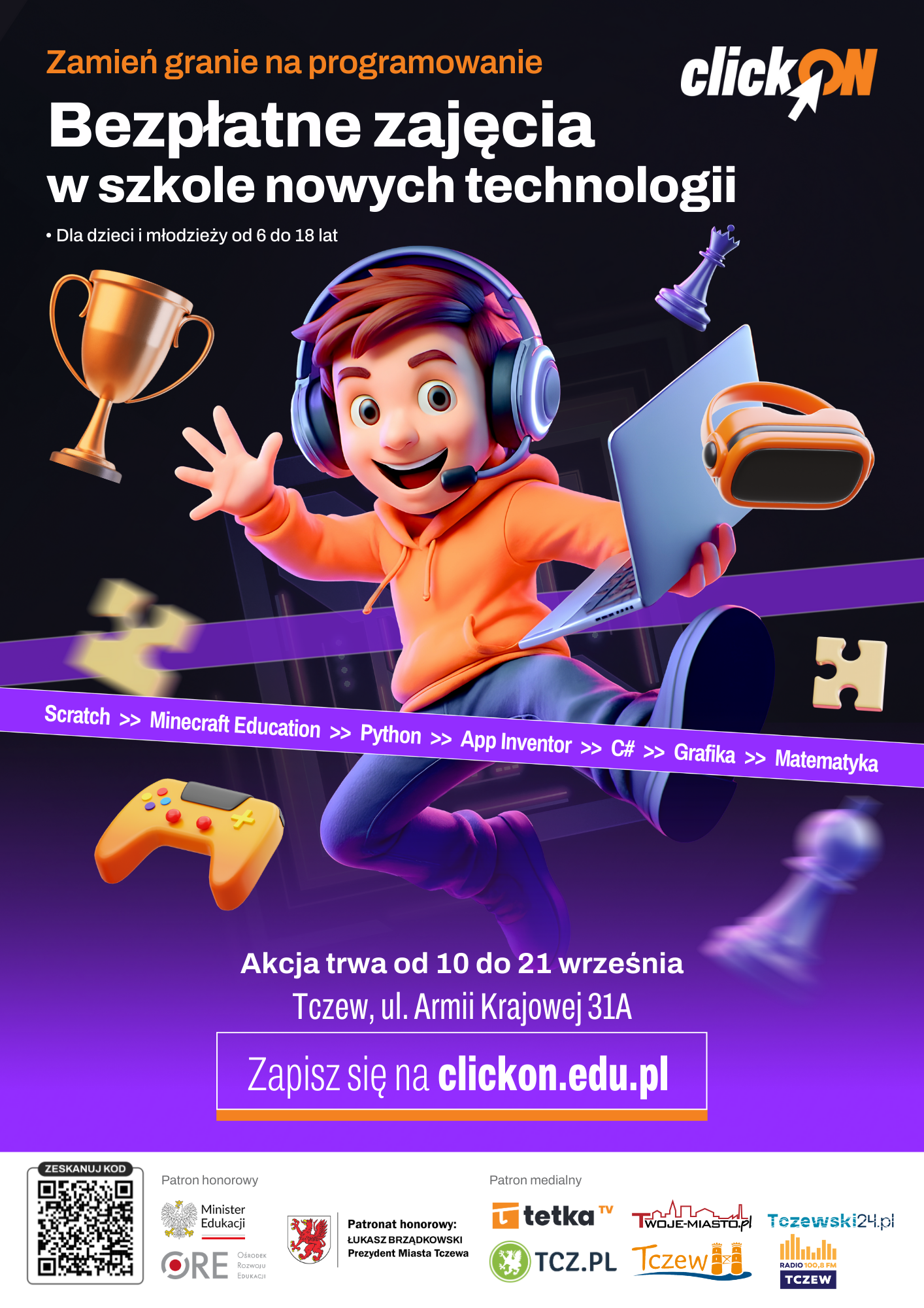 Od 10 do 21 września w Tczewie startują darmowe warsztaty programowania w ramach ogólnopolskiego projektu ClickON – „Zamień granie na programowanie”. To wyjątkowa okazja dla dzieci i młodzieży w wieku 6–18 lat, aby odkryć, że komputer może być narzędziem rozwoju, kreatywności i świetnej zabawy. Warsztaty odbywają się pod naszym patronatem.