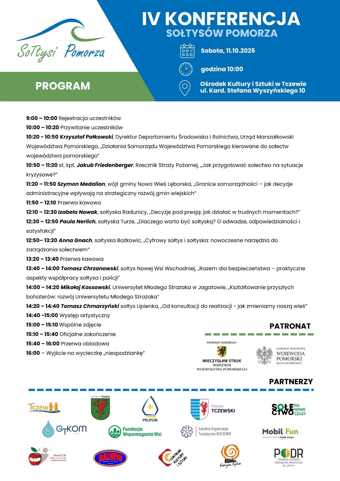 Konferencja rozpocznie się o godzinie 9:00 w Centrum Kultury i Sztuki w Tczewie, przy ulicy Kardynała Stefana Wyszyńskiego 10. Wydarzenie organizowane jest przez samorząd województwa pomorskiego we współpracy z lokalnymi ośrodkami kultury i stowarzyszeniami wiejskimi.