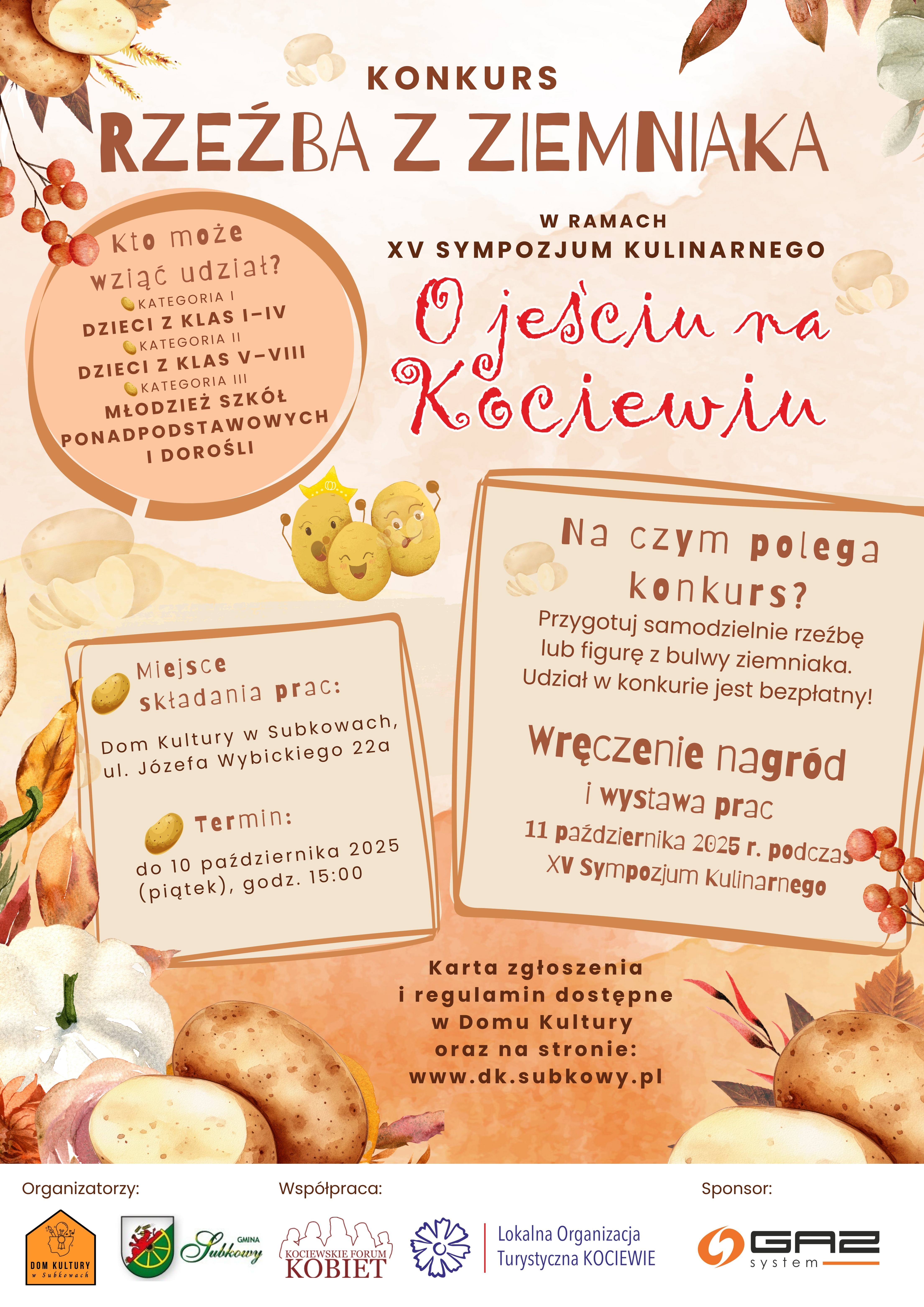 Dom Kultury w Subkowach zaprasza dzieci i dorosłych do udziału w konkursie. Zadanie jest proste - należy przygotować rzeźbę lub figurę z ziemniaka i dostarczyć ją do Domu Kultury do piątku, 10 października do godziny 15:00.