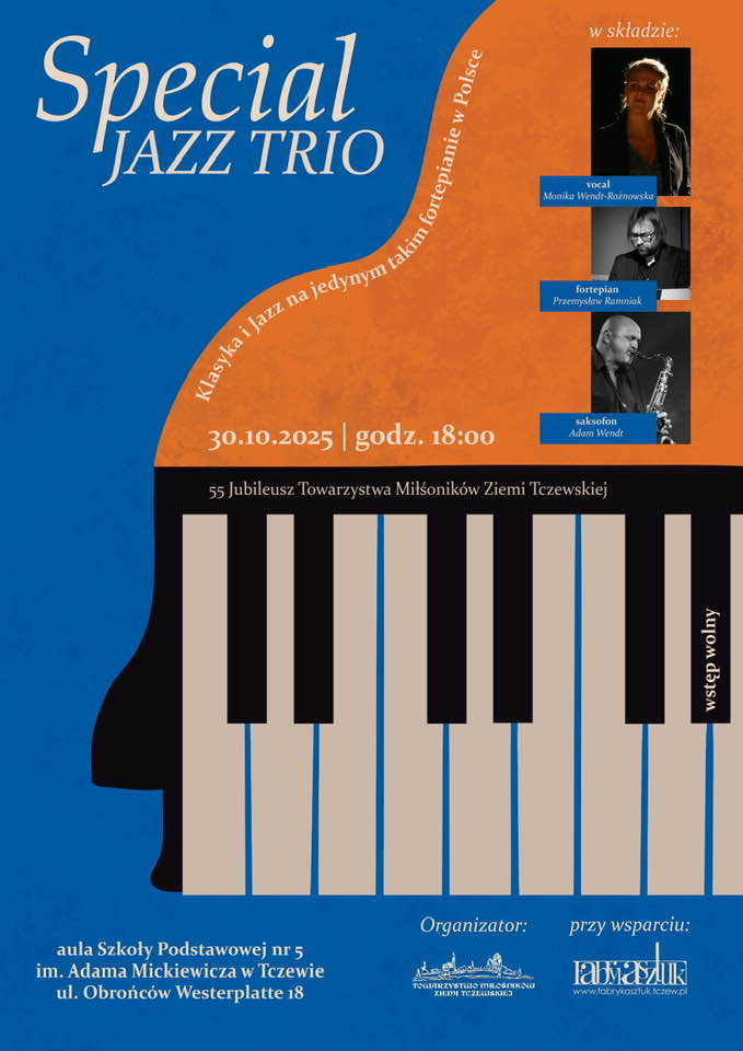 Wystąpi SPECIAL JAZZ TRIO w składzie: Monika Wendt-Rożnowska - vocal, Przemysław Raminiak - fortepian, Adam Wendt -saksofon. Podczas koncertu usłyszymy ponadczasowe klasyki muzyki jazzowej i rozrywkowej, zarówno światowe, jak i polskie.