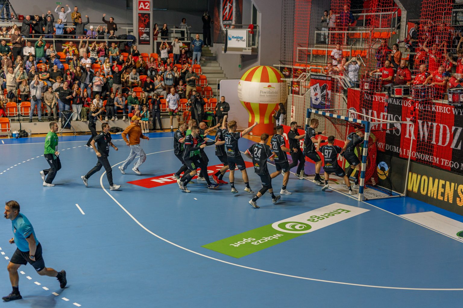 W mediach społecznościowych gospodarze poinformowali na godzinę przed rozpoczęciem spotkania, że prawie wszystkie bilety zostały wyprzedane. Do Kwidzyna razem z drużyną przyjechali kibice z Gdańska, także ci odpowiedzialni za zorganizowany doping. Na większości krzesełek zasiedli jednak fani gospodarzy, którzy czekali na zwycięstwo w derbach od grudnia 2023 roku. Pierwszy powód do radości dał im Konrad Pilitowski, otwierając wynik spotkania. Wyrównał chwilę później Jakub Będzikowski - gracz października (za co zresztą został uhonorowany na parkiecie przed meczem). Od kozła niecelny rzut oddał obrotowy czerwono-czarnych Ryszard Landzwojczak. Błędy kroków, niecelne rzuty i podania niedocierające do adresata. Te problemy autorstwa obu ekip przeplatały dynamiczny mecz. Jednym ze skutków były dosyć częste przestoje ofensywne. Do pierwszego z nich doszło już na początku. Wynik po trafieniach Pilitowskiego i Będzikowskiego zmienił się dopiero w czwartej minucie. Na prowadzenie gdańszczan wyprowadził Mikołaj Czapliński, lecz od razu stan rywalizacji wyrównał Leon Łazarczyk. Większość rywalizacji obie siódemki przechylały szalę zwycięstwa na swoją stronę.