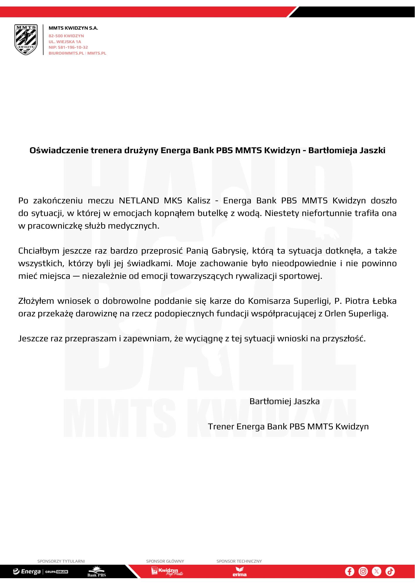 Oliwy do ognia dolał także trener Jaszka. Na zakończenie ostatniego meczu w Kaliszu w przypływie emocji kopnął butelkę z wodą, trafiając przedmiotem w pracowniczkę służb medycznych. Szkoleniowiec wystosował oświadczenie, w którym przeprosił i ogłosił, że podda się dobrowolnie karze.
