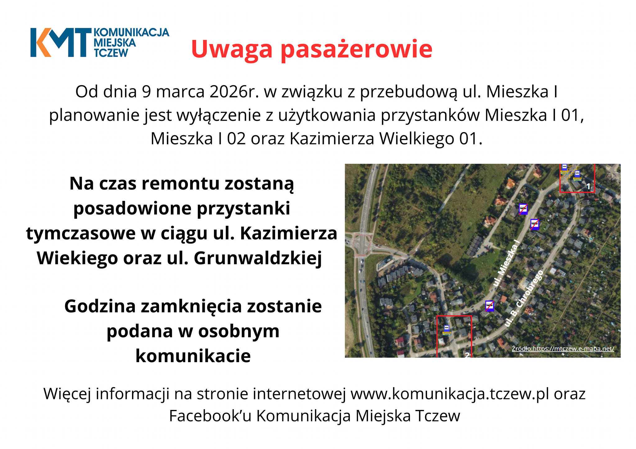 Zamiast ul. Mieszka I, ruch autobusów komunikacji miejskiej odbywał się będzie ul. Bolesława Chrobrego. Dodatkowe przystanki tymczasowe zostaną umieszczone w ciągu ul. Kazimierza Wielkiego oraz ul. Grunwaldzkiej. Szczegóły dotyczące zmian w funkcjonowaniu transportu publicznego, na bieżąco są aktualizowane na stronie internetowej tczewskiej komunikacji miejskiej.
