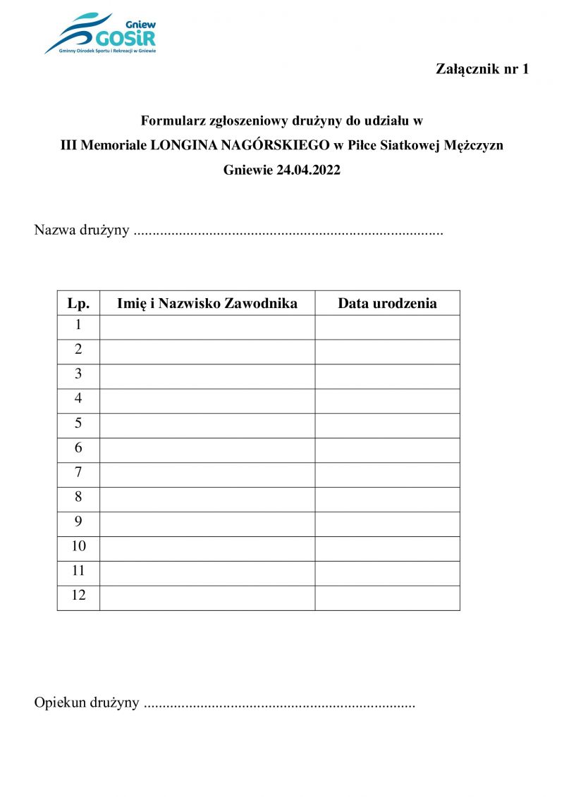 Turniej zaplanowany jest maksymalnie dla 8 drużyn. Zgłoszenia należy dokonać najpóźniej do dnia 21 kwietnia wg wzoru, który stanowi załącznik nr 1 do regulaminu, wysyłając na adres e-mail: [email protected], a w przypadku wolnych miejsc zgłoszenia można dokonać w dniu turnieju.