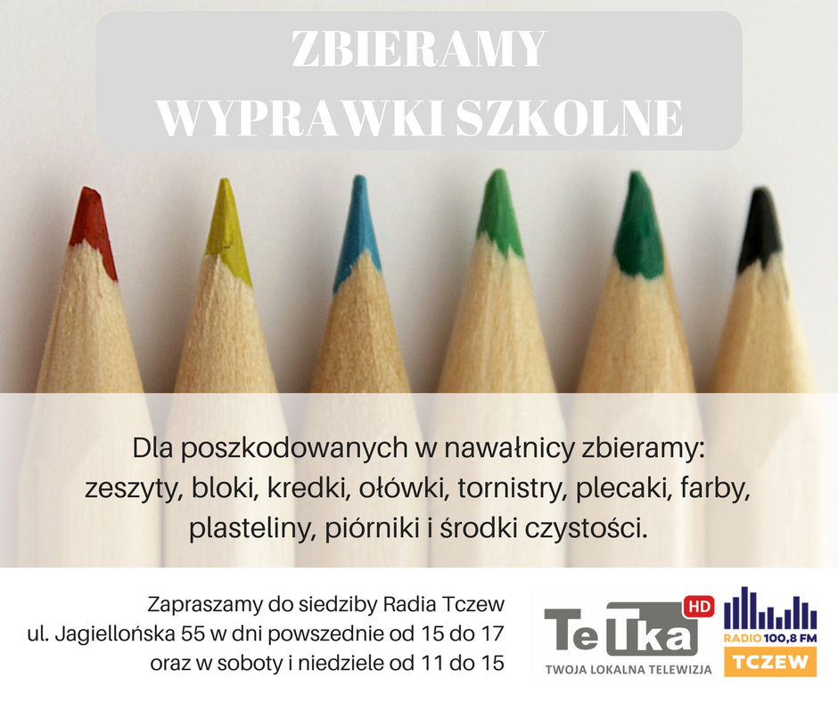 Dla poszkodowanych w nawałnicy zbieramy: zeszyty, bloki, kredki, ołówki, tornistry, plecaki, farby, plasteliny, piórniki i środki czystości.