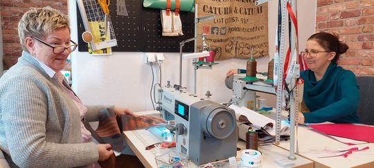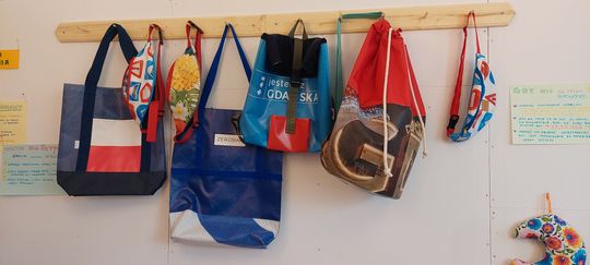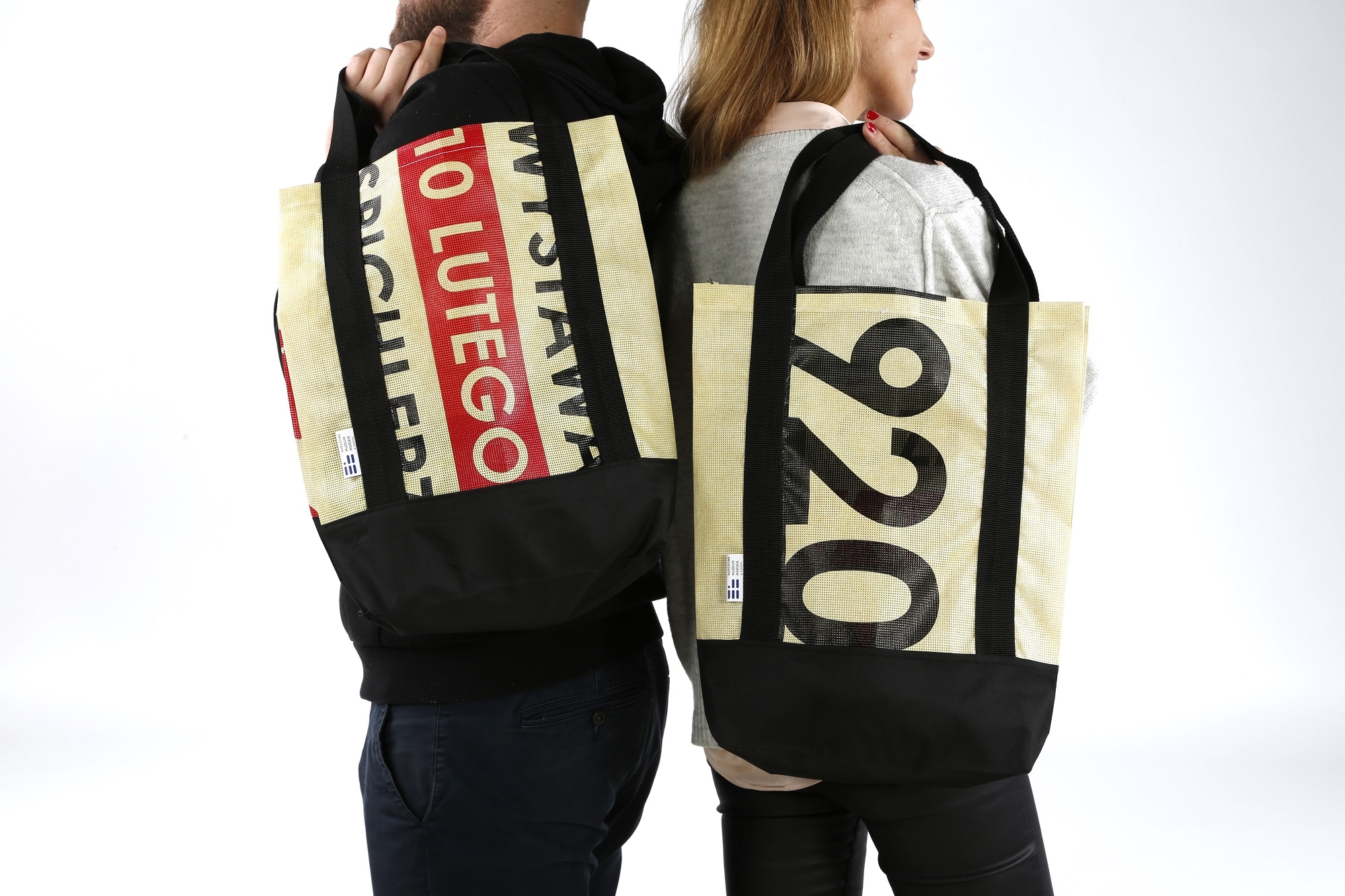 Stary baner reklamowy zyskał drugie życie - został pocięty i uszyto z niego użytkowe i trwałe torby na codzienne sprawunki.