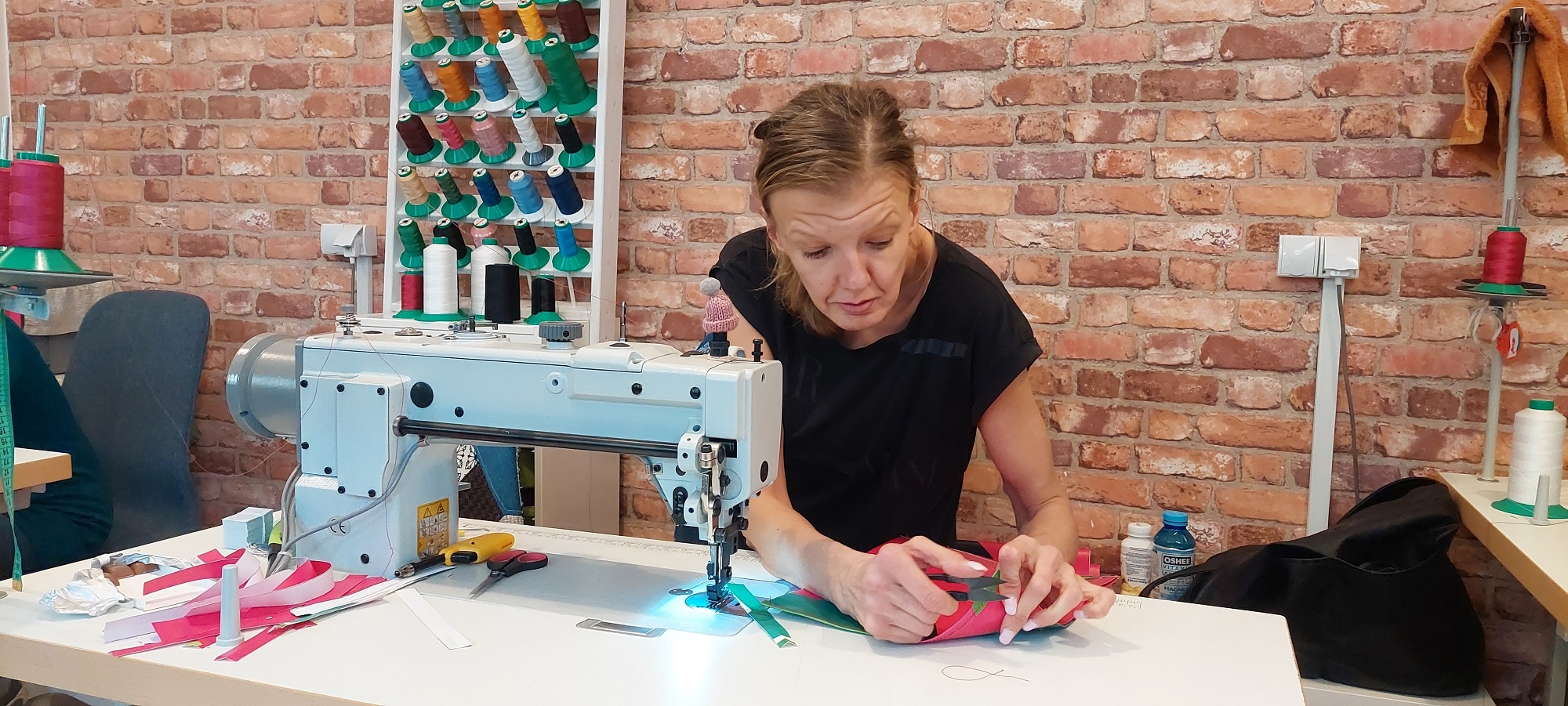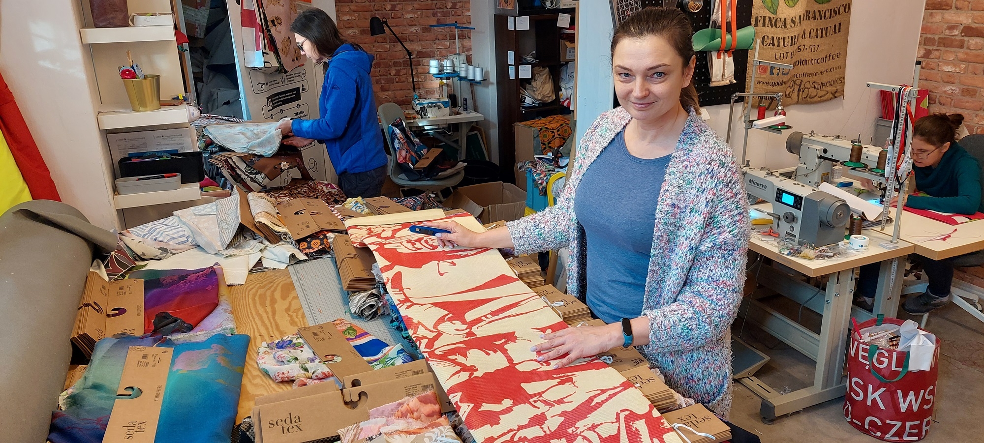 Oryginalny baner w rękach Patrycji Surowiec, członkini zarządu Spółdzielni Socjalnej ZEROBAN