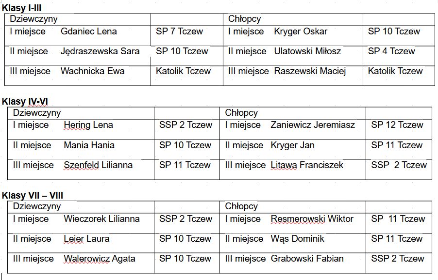 Biegi dzieci były rozegrane na przemian kategoriami dziewcząt i chłopców. Dziewczęta i chłopcy z klas I-III miały do pokonania dystans około 400 metrów, dziewczęta i chłopcy z klas IV-VI oraz dziewczęta z klas VII-VIII około 800 metrów, chłopcy z klas VII-VIII około 1200 metrów.