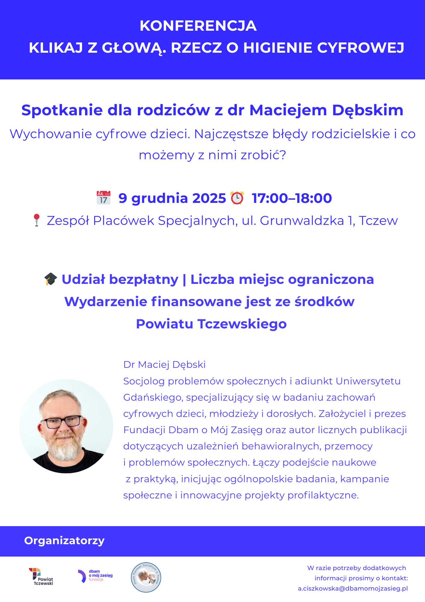 Serdecznie zapraszamy dyrektorów, nauczycieli, pedagogów, psychologów i specjalistów na bezpłatną konferencję „KLIKAJ Z GŁOWĄ. Rzecz o higienie cyfrowej”, poświęconą nowym technologiom, higienie cyfrowej oraz zdrowiu psychicznemu młodzieży.